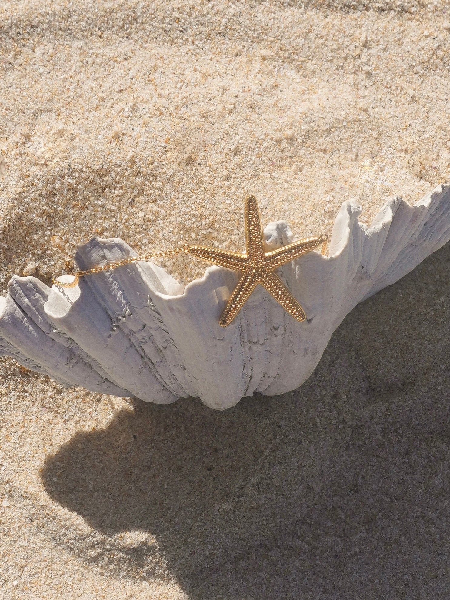 The Island Sun Necklace features a hand drawn, minimalist design with subtle texture that mimics the natural shape of a starfish. It rests gently against the skin, reminding you of the shores treasures wherever you go.